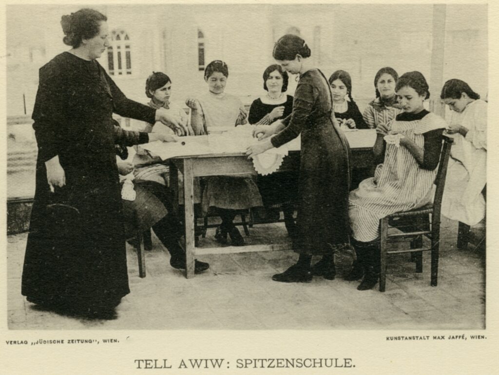 מורה ותלמידותיה לומדות את מלאכת הריקמה והתחרה בבית ספר למלאכת יד, תל אביב, 1912. צלם: ליאו קאהן, נדפס בעיתון Juedische Zeitung, וינה. ישראל נגלית לעין, אוסף אלי שילר, מרכז תיעוד יד יצחק בן צבי